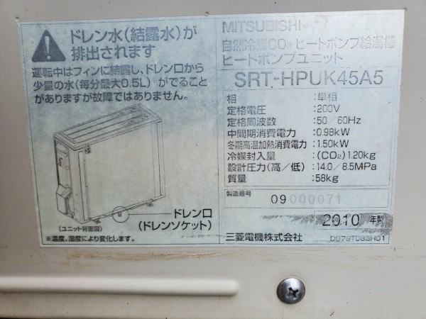 穴水町 三菱電機エコキュートSRT-HPUK45A5→コロナ自然冷媒CO2家庭用ヒートポンプ給湯機ヒートポンプユニットCHP-Y454K エコキュート交換工事